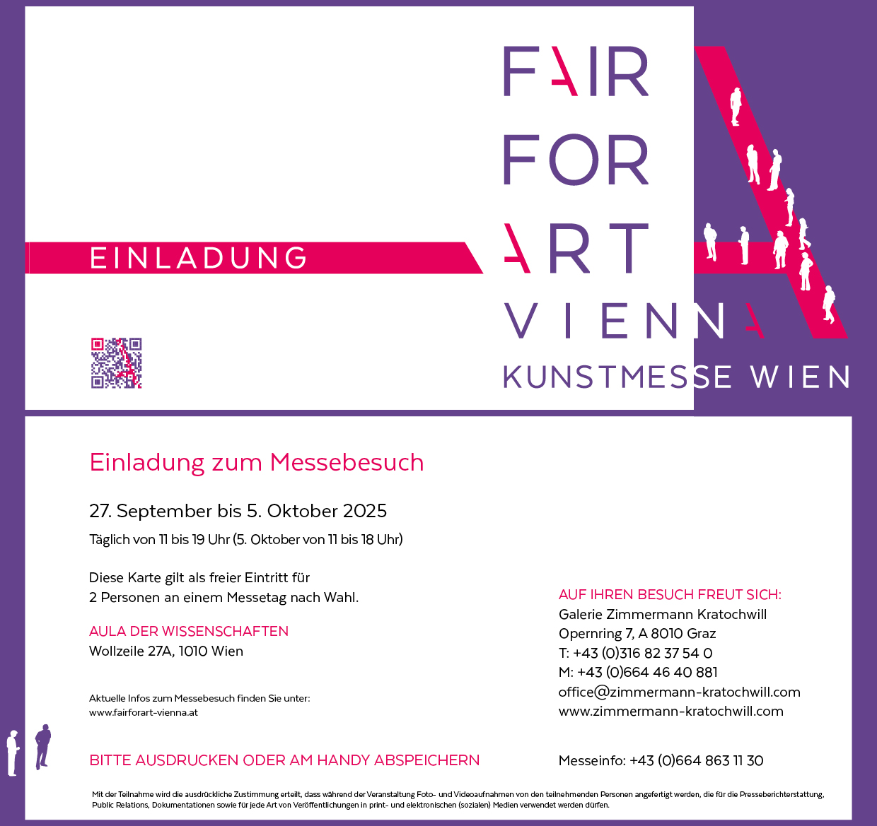 Ihr habt die Möglichkeit, eine der folgenden Einladungen auszudrucken, bzw. sie in digitaler Form beim Einlass vorzuzeigen um gratis bei der FAIR FOR ART Vienna dabeizusein. Die Datei findet Ihr unter Documets